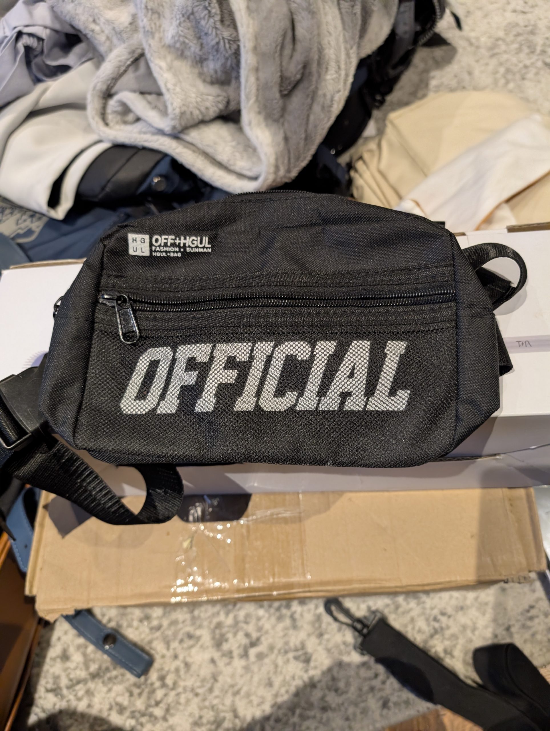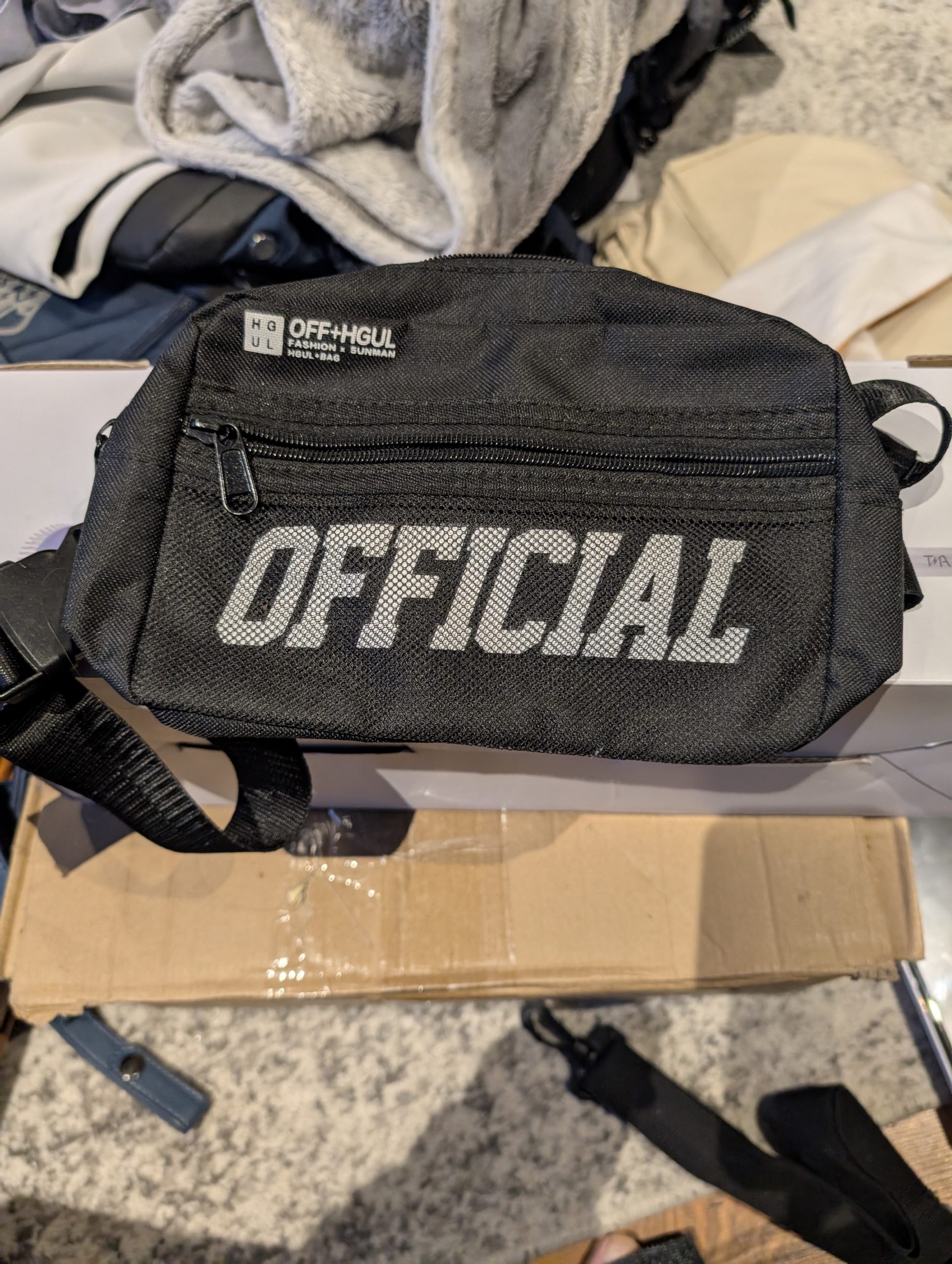 “OFFICIAL” branded tri-strap utility bag, specifically the Off + Hgul Tri Strap Utility Bag. This type of bag is designed for everyday use and features a heavy-duty nylon fabric with woven nylon molle loop straps and premium hardwareIt has a classic, minimalist look, making it suitable for various outfits. The bag is designed to be worn across the body, providing a secure and convenient way to carry essentials. It’s smaller than a daypack, making it ideal for carrying items like a wallet, keys, phone, and earbuds. The utility bag has a multi-layer storage design with zippered compartments, making it convenient for organizing and accessing items while traveling. The bag is made from wear-resistant Oxford cloth, ensuring durability.